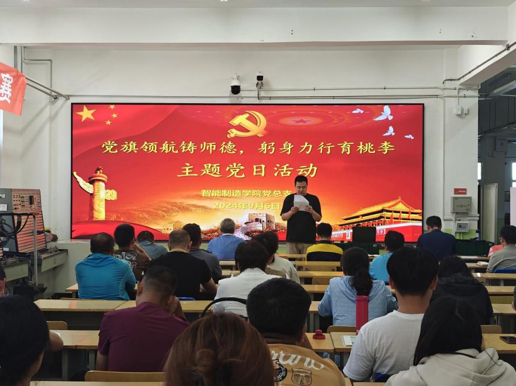 为热烈庆祝中华人民共和国成立75周年,深入贯彻落实党的二十届三中全会精神,9月6日,智能制造学院党总支在四号实训楼开展了“党旗领航铸师魂,躬身力行育桃李”主题党日活动。党总支书记董大伟、院长孙志刚、党...
