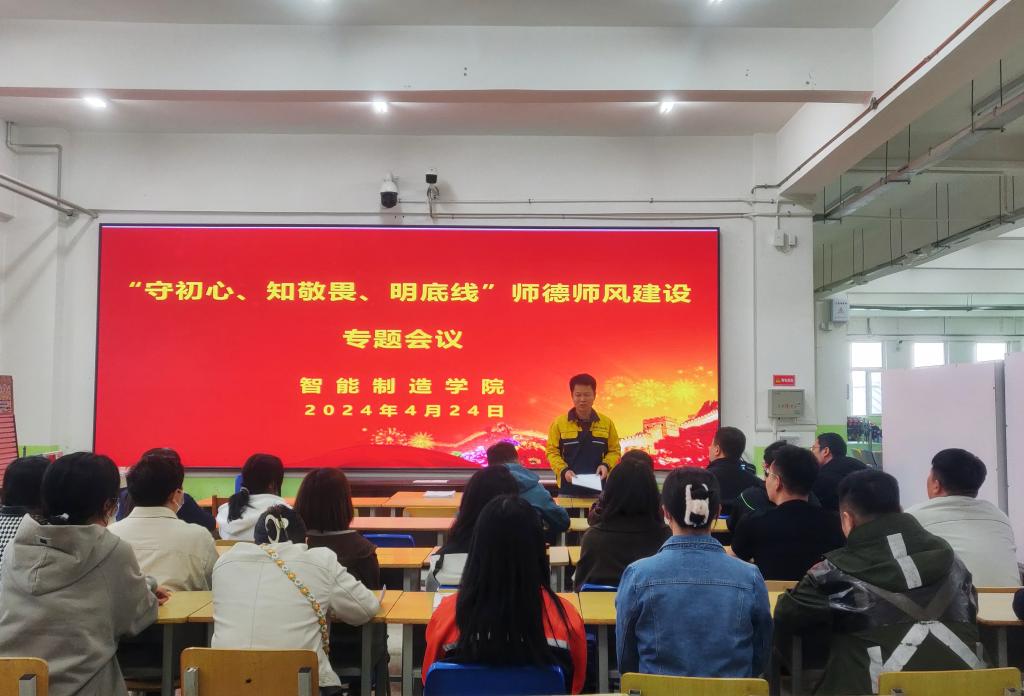 为进一步贯彻落实党的教育方针,加强我院师德师风建设,严明底线红线,打造德才兼备的高素质队伍,营造风清气正的育人环境。4月24日下午,智能制造学院召开了“守初心、知敬畏、明底线”师德师风建设专题会议...