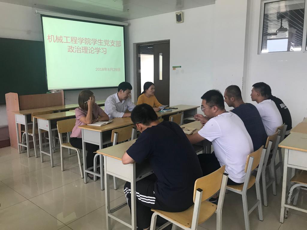 2018年8月29日机械工程学院学生党支部开展主题党日学习活动,我院党总支书记刘锡权、学生党支部书记王婧婧以及学生党支部全体党员参加了学习活动。