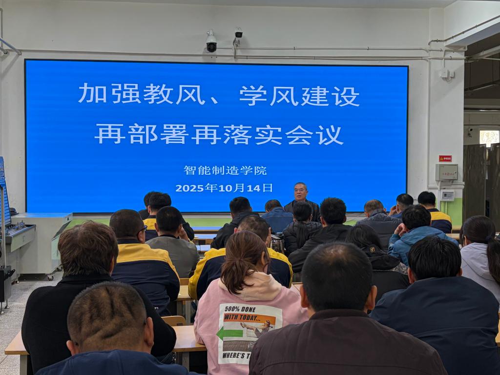 2025年10月14日,智能制造学院组织召开了 “加强教风、学风建设再部署再落实会议”,会议在实训基地二楼召开,全体教师参会。会议着重强调必须严格落实吉林铁道职业技术大学教风、学风管理文件要求,全力推进学院教风与学风建设工作迈上新台阶。