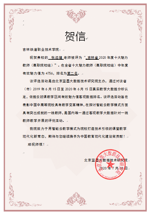 7月30日,我校接到北京蓝墨大数据技术研究院发来的贺信,机械工程学院焊接自动化教研室张远健老师,被评为“吉林省2020年度十大魅力教师(高职院校组)”。