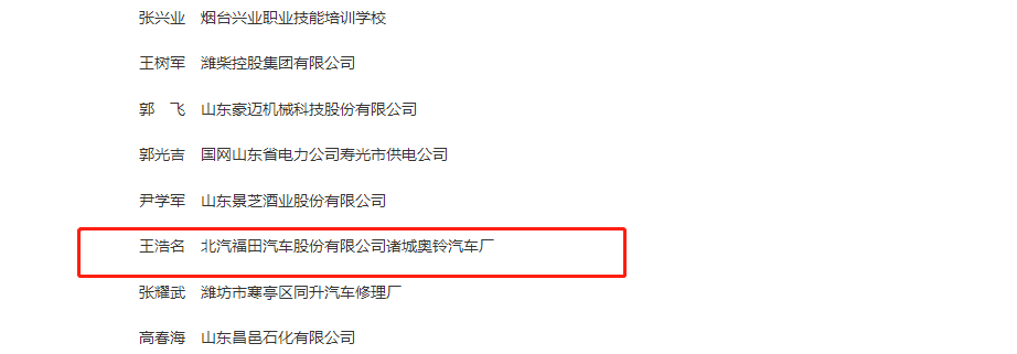 毕业后,王浩名到北汽福田汽车股份有限公司诸城奥铃汽车厂工作。在工作期间,爱岗敬业、刻苦专研、精益求精,不断在工作中、各种大赛中获得各种荣誉表彰。由于其出色的工作表现,2015年被全国总工会授予“全国五一劳动奖章”,2017年被人力资源和社会保障部授予“全国技术能手荣誉称号”......2018年12月,经逐级推荐、选拔,山东省人才工作领导小组研究同意,山东省政府批准,王浩名同志被评为齐鲁首席技师。